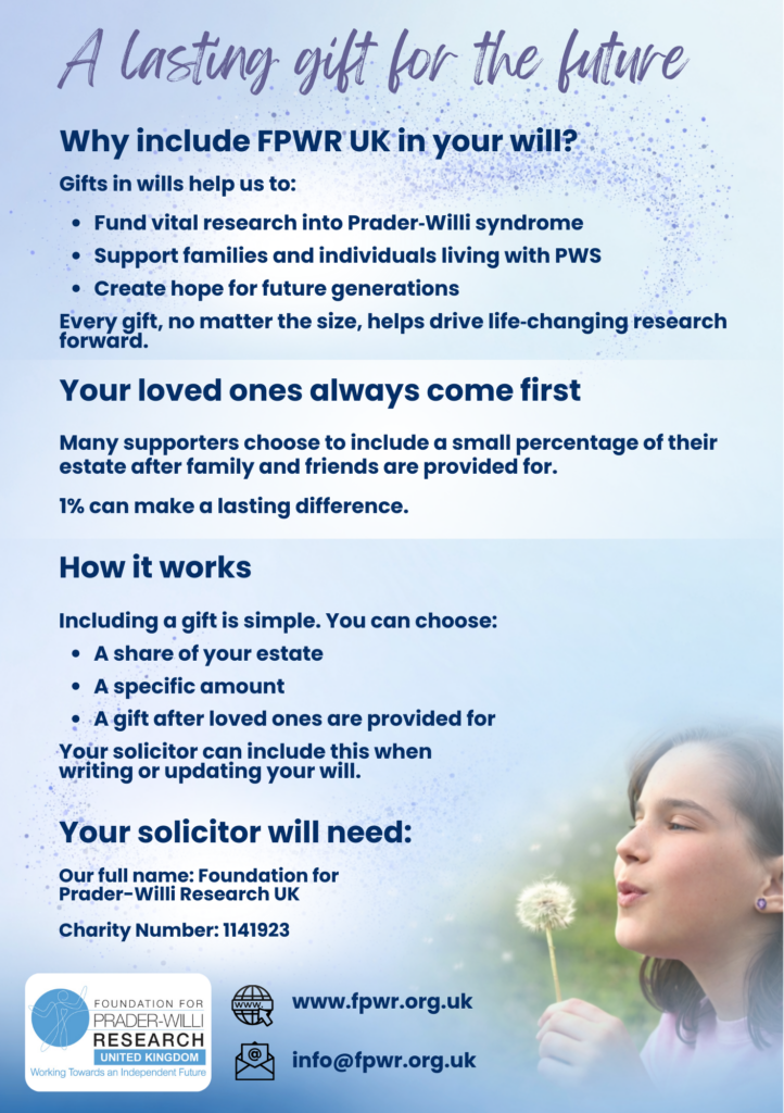 By including a gift to Foundation for Prader‑Willi Research UK (FPWR UK), you can help create lasting change for people living with Prader‑Willi syndrome (PWS) and for the families who love and support them.