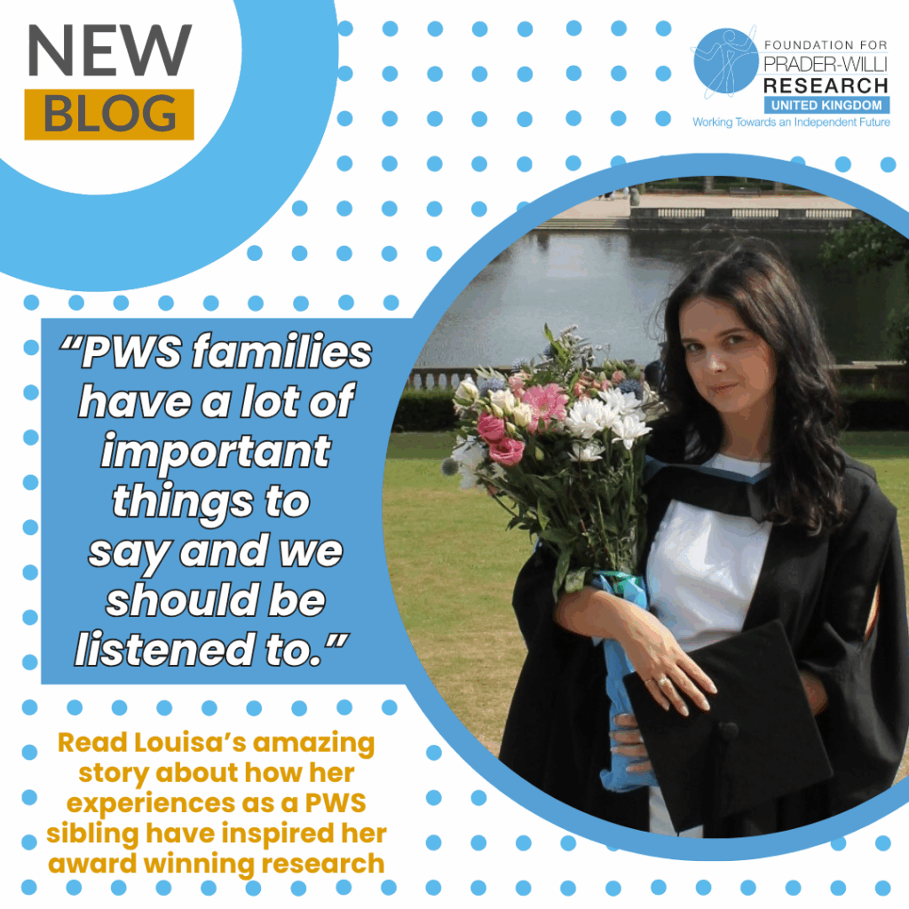 We are excited to share a guest blog from Louisa Williams, who recently has completed some important research into the effects of PWS on family members. Louisa, whose own brother has PWS, wanted to cover the important topic but give it a more personal approach than other studies in the past. With the help of the PWS Community Louisa’s research won a University prize and is now on it’s way to being published. Find out more from Louisa herself…
