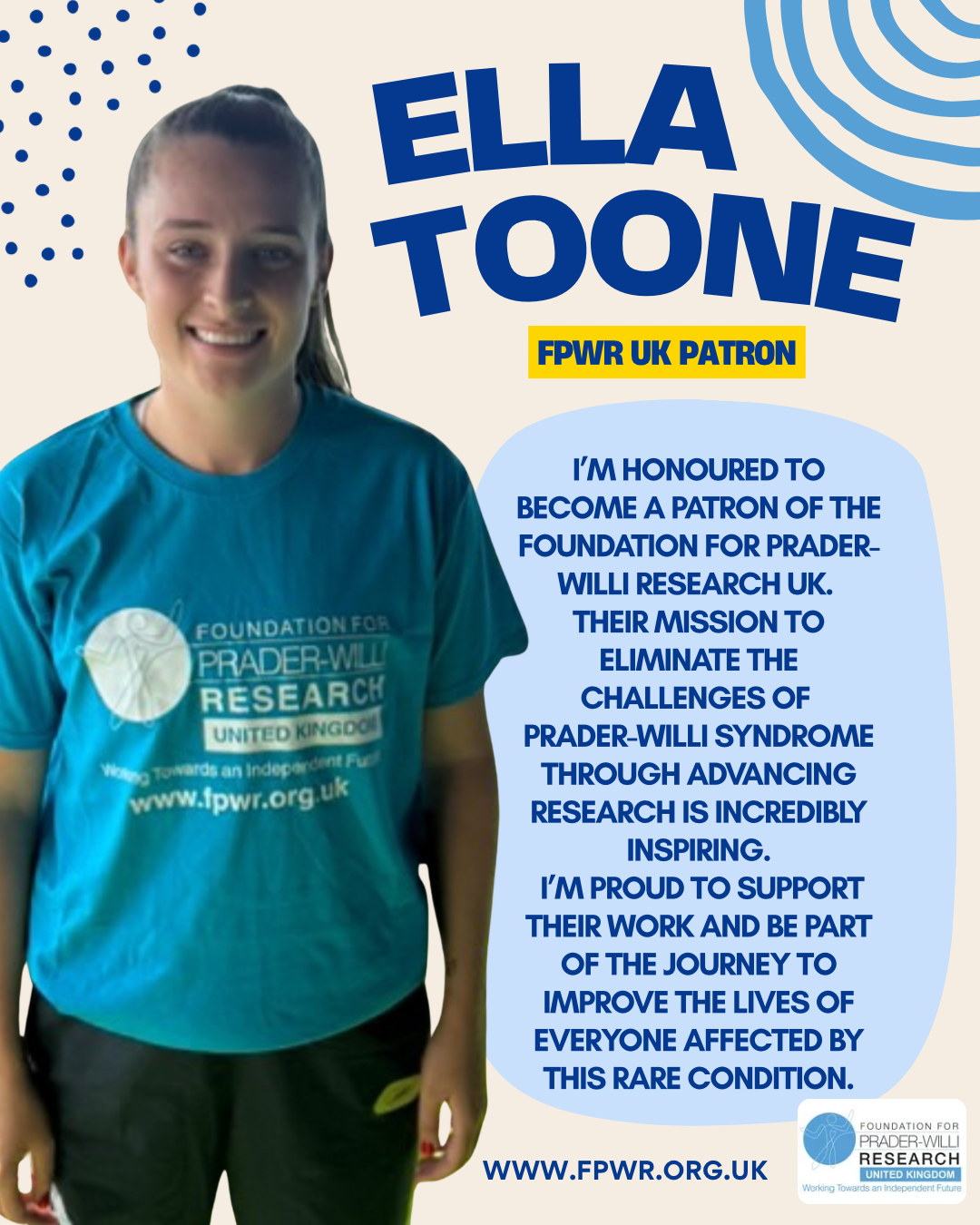 As a two-time European Cup winner with the England Lionesses and a standout midfielder for Manchester United, Ella brings a powerful message about the value of health, fitness, hard work, and commitment. Her dedication on and off the pitch makes her an inspiring role model and will help us shine a brighter light on PWS. Her passion, energy, and compassion make her the perfect ambassador for our cause, and we are incredibly grateful for her continued support.